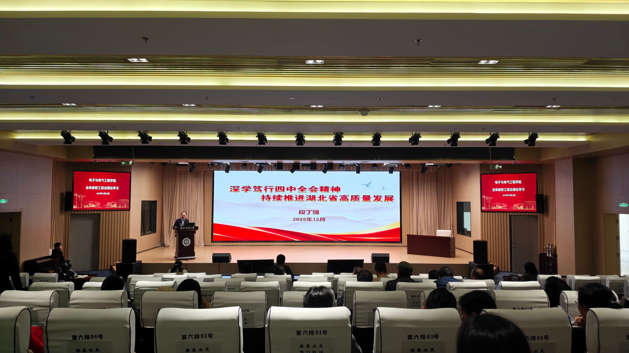 12月19日上午,我院在建全会堂稳建厅举行党的二十届四中全会精神宣讲暨党委理论学习中心组(扩大)学习,校党委组织部部长段丁强以《深学笃行四中全会精神 持续推进湖北省高质量发展》为主题作辅导报告。会议由学院党委书记张红鑫主持,学院领导班子成员、党委委员、教师党支部书记、学生党支部书记、系主任、工会委员、教授委员会委员、民主党派人士以及其他教职工参加学习。