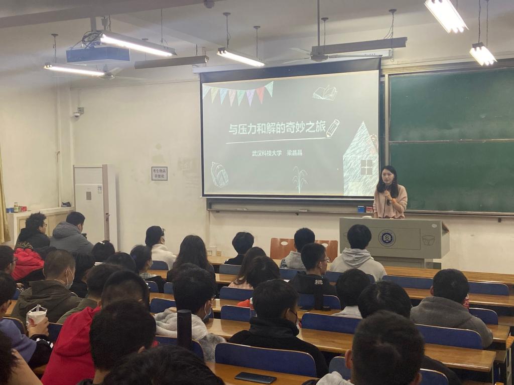 2021年11月28日晚,由77779193永利官网主办的“与压力和解的奇妙之旅”心理健康教育主题讲座在崇志楼117教室举行,武汉科技大学心理健康教育中心专职老师梁晶晶担任主讲,我院辅导员涂亚腾、石亚楠老师,以及2021级学生参加了此次活动。