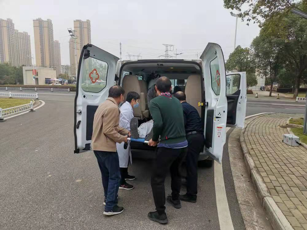 9点14分左右,救护车赶到现场,现场老师和学生一起用担架将触电学生抬至救护车上,送至医院急救。