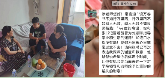 8月15日,20级辅导员石亚楠专程赶到黄陂区走访了通信12101班小熊同学,小熊同学是单亲家庭,平时习惯了自我封闭,不太喜欢和同学交流,此次家访,母亲很感动,谈及了很多平时没有老师们没有发现的问题,也讲了很多孩子和家庭的成长故事,让石老师也感触颇深。她说:“这一趟家访,让我改变了对一个孩子的看法,改变了对一个家庭的认识,更是改变了我对教育的认知。不家访,你永远也无法了解藏在学生性情成绩背后的原因,无法给学生真正的教育,无法打通通往孩子心底的那一公里,永远不懂立德树人真正的含义。”