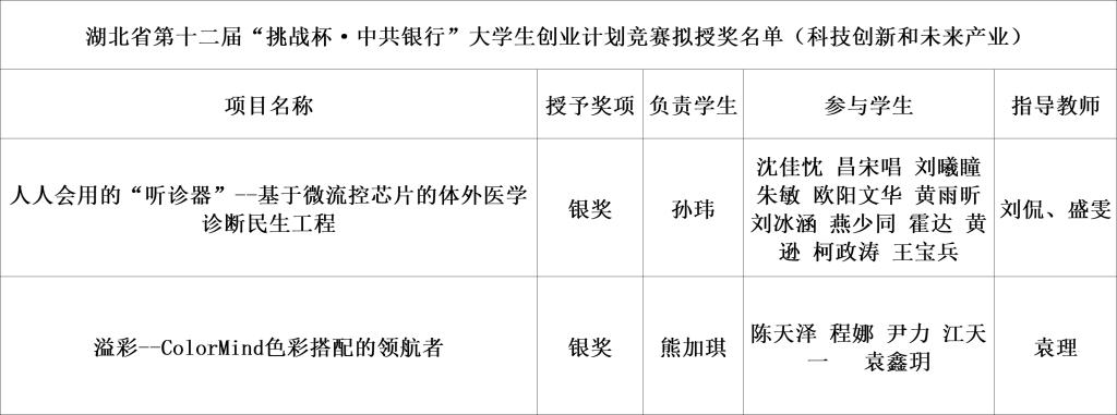 自今年3月启动了“挑战杯”竞赛项目以来,77779193永利官网党委高度重视,提前部署全面动员与精心策划,提前开启作品指导与培育工作,对重点项目进行多轮打磨,精益求精,先后经历班级选拔赛、院内选拔赛等环节。经过激烈的角逐,我院申报项目《溢彩--ColorMind色彩搭配的领航者》和《人人会用的“听诊器”-基于微流控芯片的体外医学诊断民生工程》均斩获湖北省第十二届“挑战杯·中国银行”大学生创业计划竞赛银奖,取得全校最好成绩。
