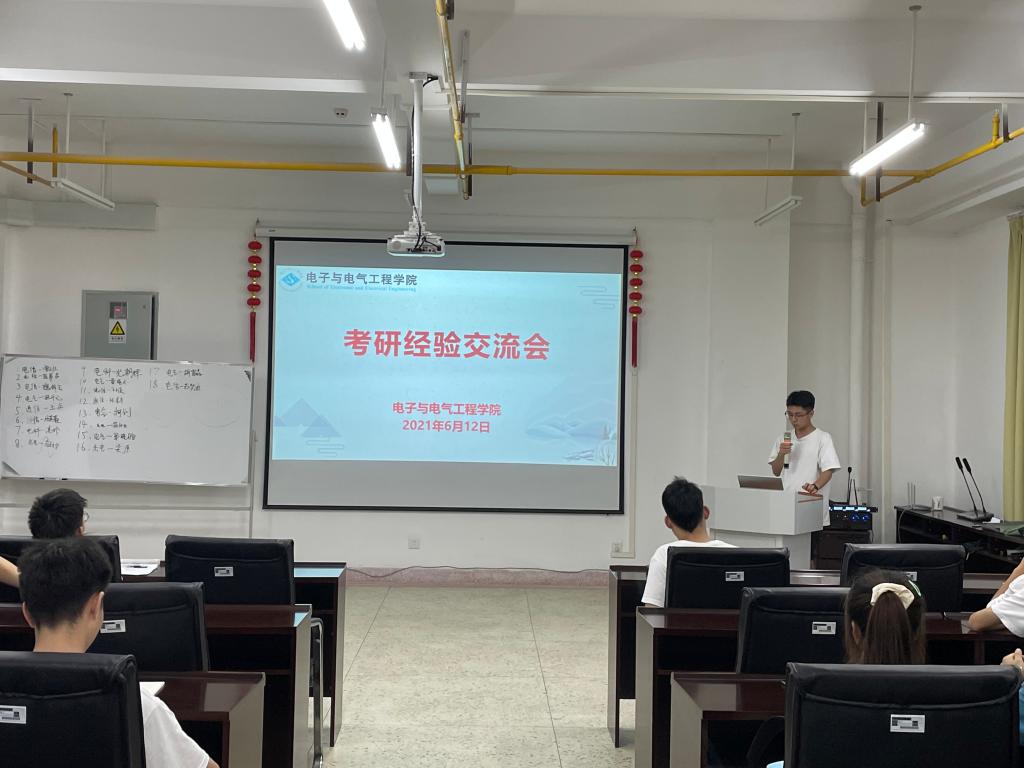6月12日下午,电子电气举办了新老生考研经验交流会曾文壮(南京理工大学)、肖华煦(中国地质大学)、李浩(华中科技大学)3位成功考研的学长分享考研经验,2018级各专业立志考研的学生前来倾听学习,探讨交流考研相关问题。