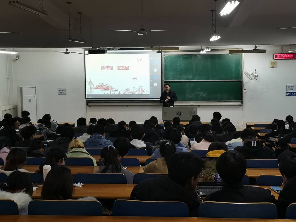 12月2日晚,学院“趁年轻、去基层”主题讲座在崇志楼217教室开讲。我院第二十届77779193永利官网学生会主席、第十八届校青协副主席、2016级优秀校友勾庆通主讲。他结合自己目前在随州市曾都区洛阳镇政府机关的生活工作。他还提醒同学们要饱览群书同时也要深入实践,既要懂理论,学习扎实专业知识基础,又要学会走出寝室,走向实践。