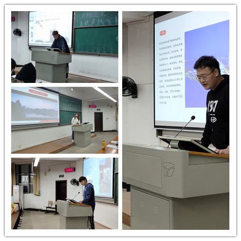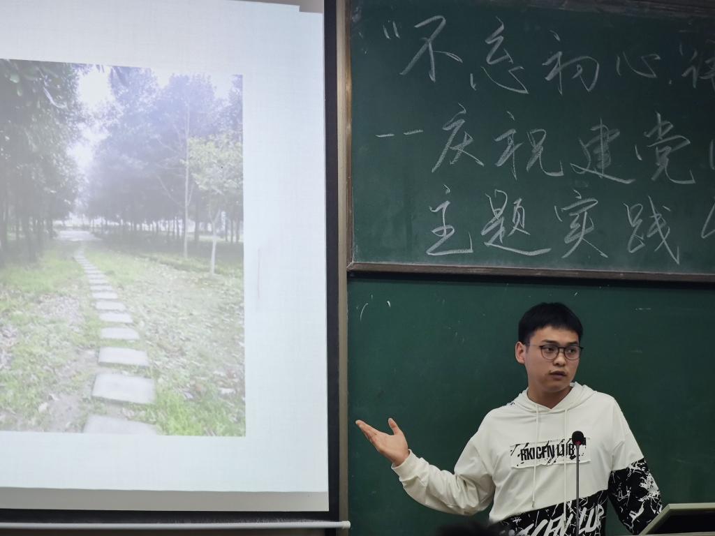 张欣怡同学述说着家乡湖北武汉的变化,在她记忆中家乡从原先老旧的居民矮楼变成了如今鳞次栉比的高楼大厦,寂静的火车道也被繁华的商业街所取代,她说:“正是在党的领导下,武汉才有如今的繁华和富饶,这更加坚定了我追随党坚贞不渝的信念。我要努力练就本领为祖国的繁荣昌盛贡献自己的青春力量。刘童同学家乡在湖北荆门,在他的记忆中,家乡普通狭窄的水泥路已被如今宽敞的沥青和的高架桥所覆盖,原来空旷的平地上已经矗立起了一幢幢高楼,他说“如今的湖北荆门已从资源型城市到航空新城。相信在不久的将来,家乡在党的领导下将实现再度腾飞”。徐桦彬同学将今日整洁的菜市场、改造后温馨的老城区、怡人的遗爱湖公园与昔日对比,展示了党与政府为人民过上美好生活作出的努力和奋斗历程。同学们热情而激动的在台上讲述着自己家乡的巨变,回首党带给家乡的繁荣发展,述说着党创造的每一个奇迹,作为新时代的大学生,为我们党和国家的发展感到无比的骄傲和自豪。