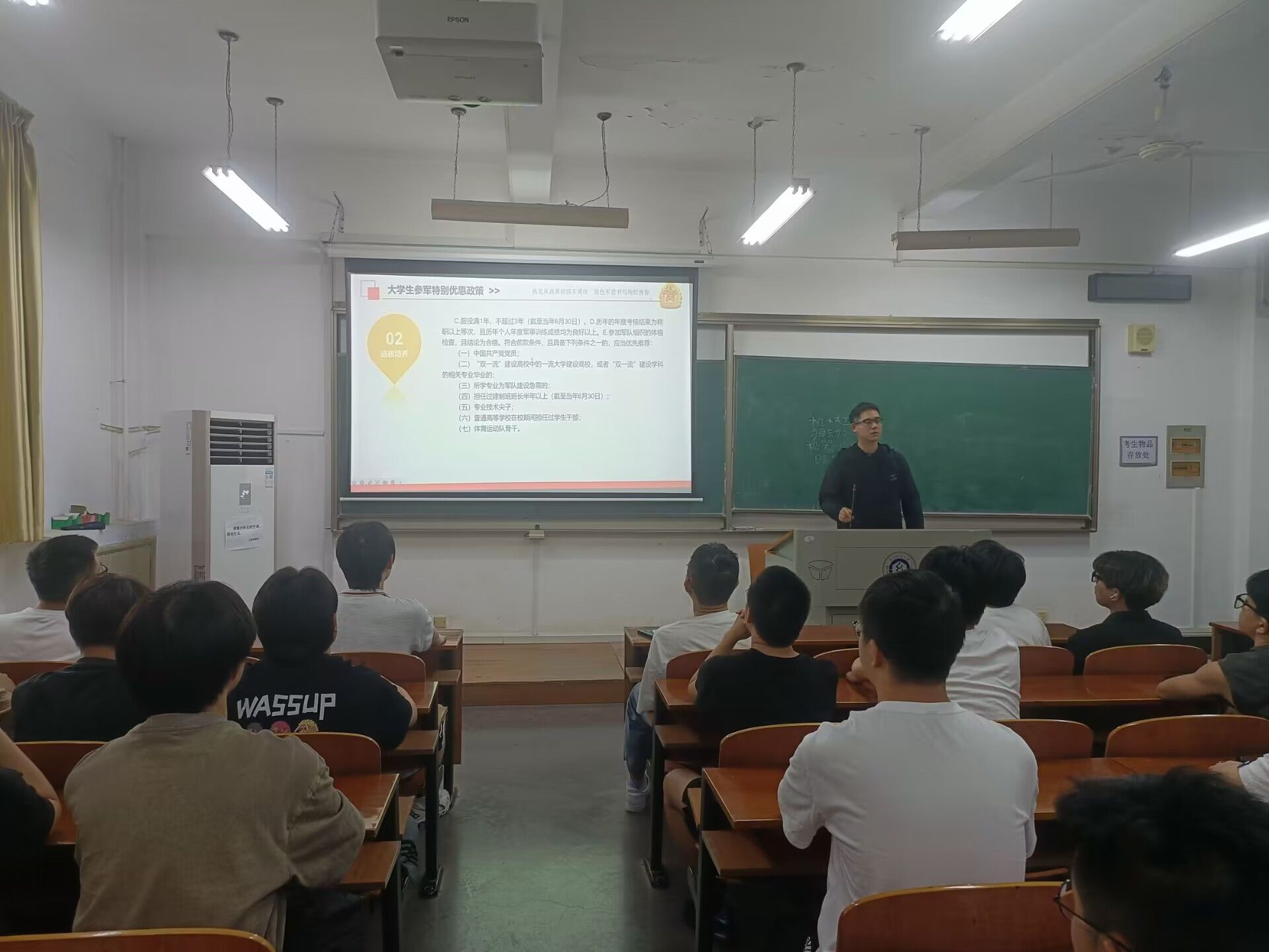 班会上,各班辅导员、班主任及副班主任从年龄、身体条件、学历要求等方面的规定,到军队中的待遇和保障,以及退役后的就业、升学等方面的优待措施,一一进行了详细的阐述,通过图片、视频等方式,详细说明了报名阶段、材料提交、体检政审、学籍保留等方面需注意的问题,并介绍了入伍大学生学生参军的各项规定和要求。